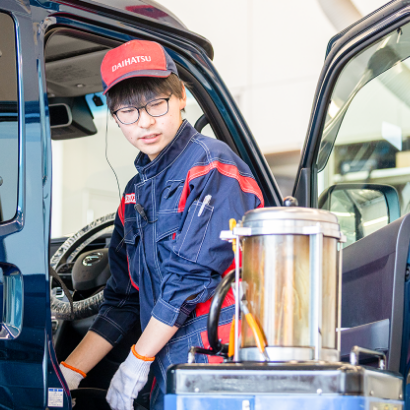 主に車の定期点検やオイル・タイヤの交換など、一般的な整備作業を担当しています。点検では、お客さまの車の各部を確認し、異常がないかを丁寧にチェックします。さらに、点検の結果をお客さまにご説明したり、車の状態に応じて、安全に長くお乗りいただくために必要な部品の交換を提案する接客業務も行っています。