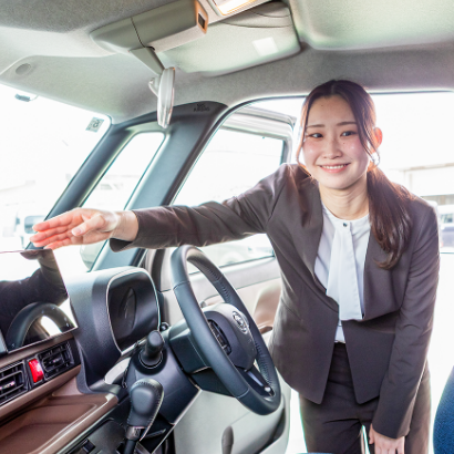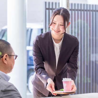 ご来店されたお客さまのお出迎えや受付、オリジナルドリンクとスイーツによるおもてなしが店舗スタッフの主な業務です。また、営業スタッフが商談などでお客さま対応ができない時は、試乗のご案内や簡単な車の説明といったサポートも担当します。さらに、入出金の記録や管理などの事務業務も大切な役割の一つです。